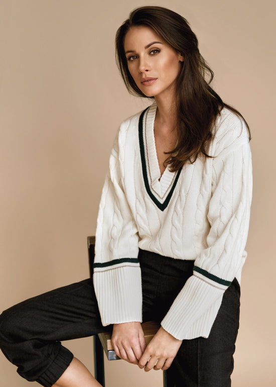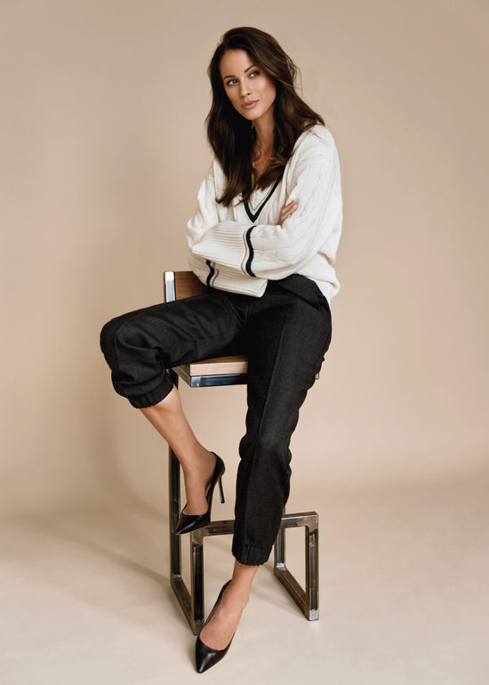 Egy könnyed ebéd a barátnőkkel vagy egy spontán randi? Számomra ez az ideális szett az efféle programokhoz, mert kényelmes, de mégis van benne valami plusz. A gyapjúpulóver részletgazdag, kötött anyaga, a határozott v-kivágás és a sötétzöld díszítések egy igazi statement darabbá teszik ezt a felsőt. Éppen ezért csak egy egyszerű, gumis szárú nadrággal párosítottam, végezetül pedig felkaptam egy basic magassarkút, ami megtöri az outfit casual jellegét és vagánnyá varázsolja azt.