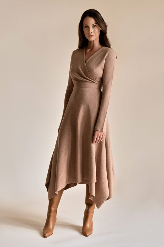 Ez a kényelmes, puha gyapjúruha egyszerűen tökéletes a hűvösebb időre! Amellett, hogy melegen tart még végtelenül kifinomult is, ami a minőségi anyagnak, az ízléses tevebarnának, a megkötős derékrésznek és az egyedi, aszimmetrikus alsó résznek köszönhető. Hosszú bőr csizmával párosítottam, így számos téli eseményre el tudom képzelni ezt a szettet, a romantikus téli programoktól egészen a karácsonyi vacsorákig.