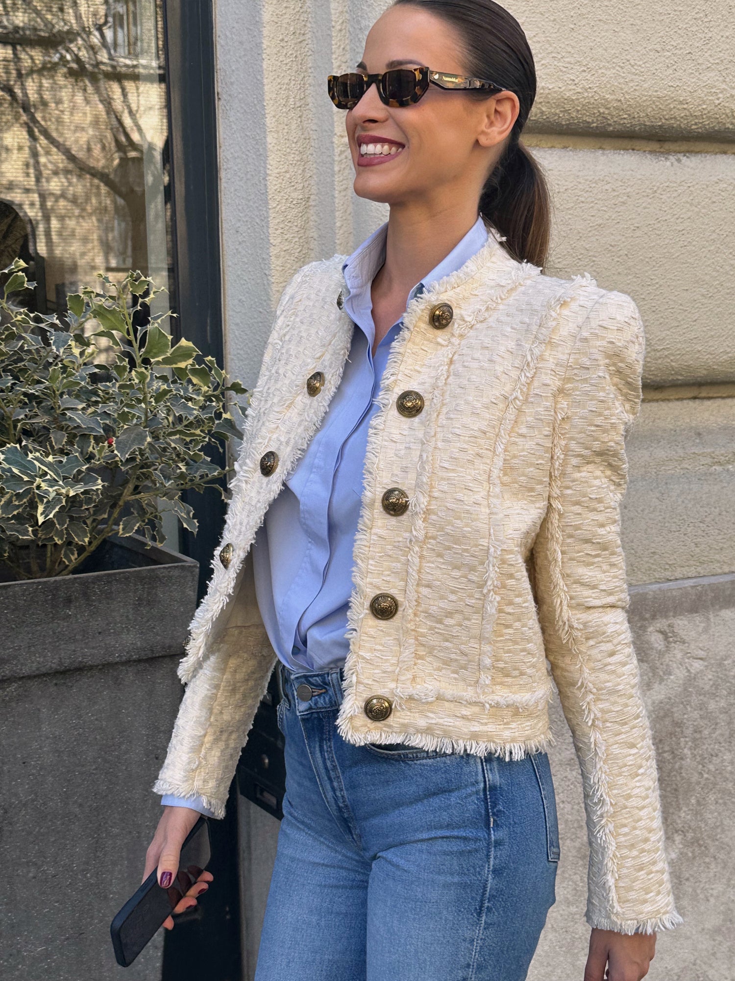 A szett középpontjában egy fehér rojtos Balmain blézer áll, amely garantáltan felkelti az érdeklődést. A rojtok játékos megjelenést kölcsönöznek a blézernek, és egyedi varázslatot adnak az összhatáshoz.