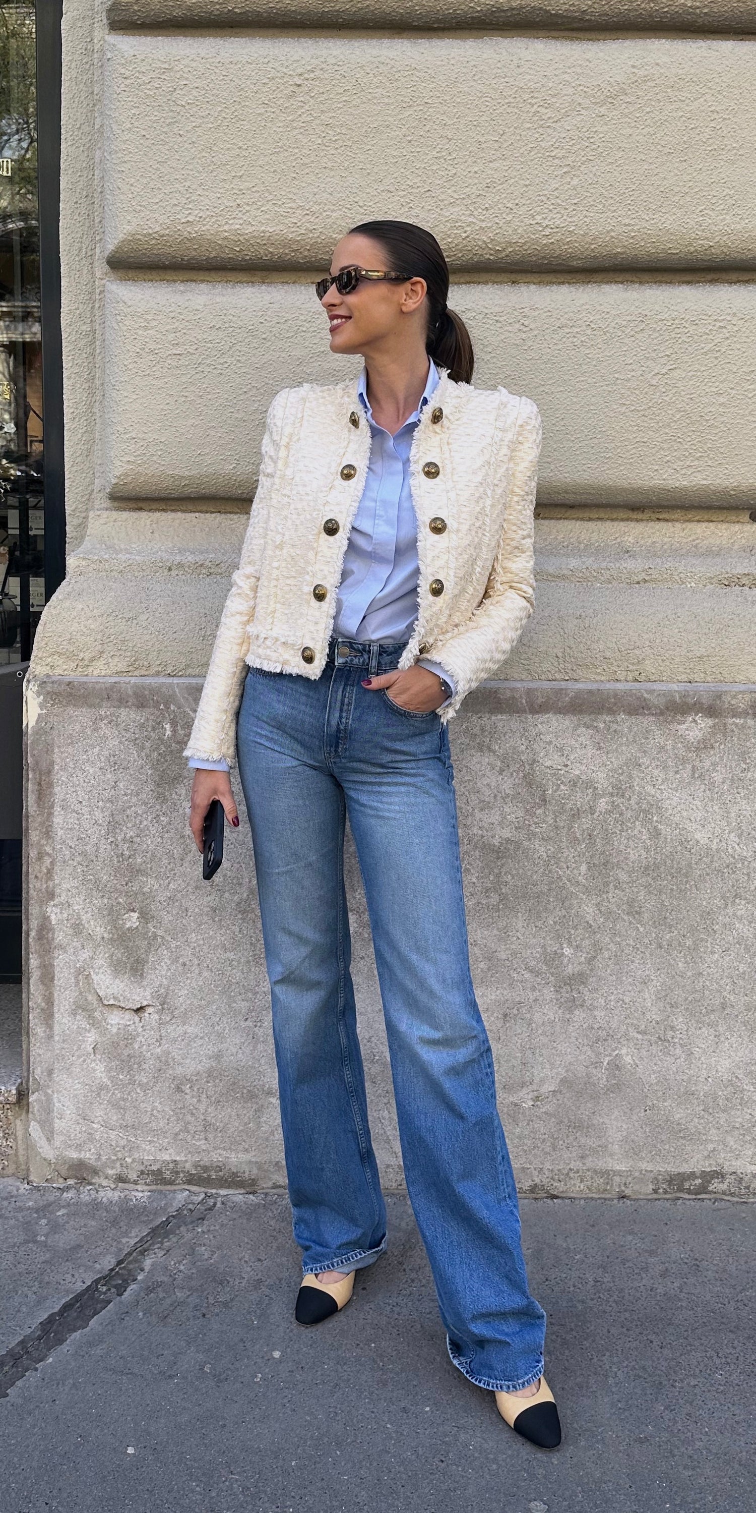 A szettet egy klasszikus Chanel slingback cipővel egészítettem ki, mely elegáns és időtálló választás. A slingback cipő kényelmes és stílusos, és remekül illeszkedik a bohém stílushoz.