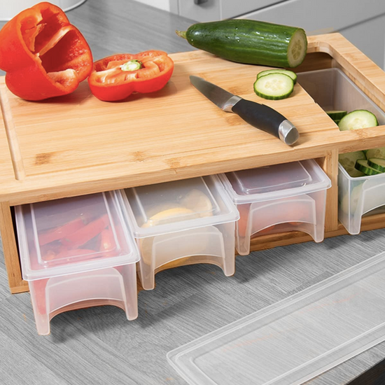 Bambusz fa vágódeszka 4 darab BPA-mentes műanyag fiókkal és dobozzal, ami a helytakarékos dizájn kedvelőinek készült. A dobozok a vágódeszka alatt tárolhatók, és utána egyből a hűtőbe rakhatók. Egyszerű és kényelmes megoldás a praktikus konyha jegyében.