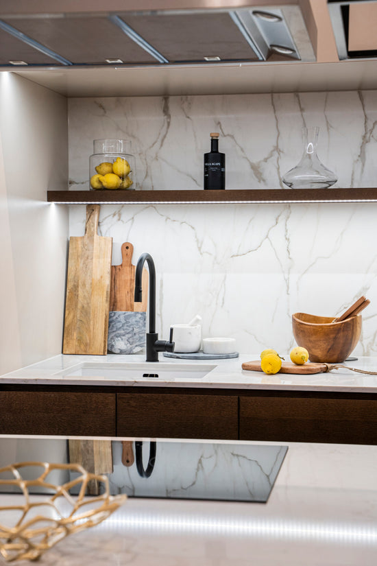 Mindig jól mutat, ha polc stylingnál egyes elemeket különböző szinteken megismételsz; ez egy harmonikus összképet eredményez. Figyeld meg a fotón, hogy milyen kellemes hatást kelt a konyhapulton is visszaköszönő, vibráló citromsárga!