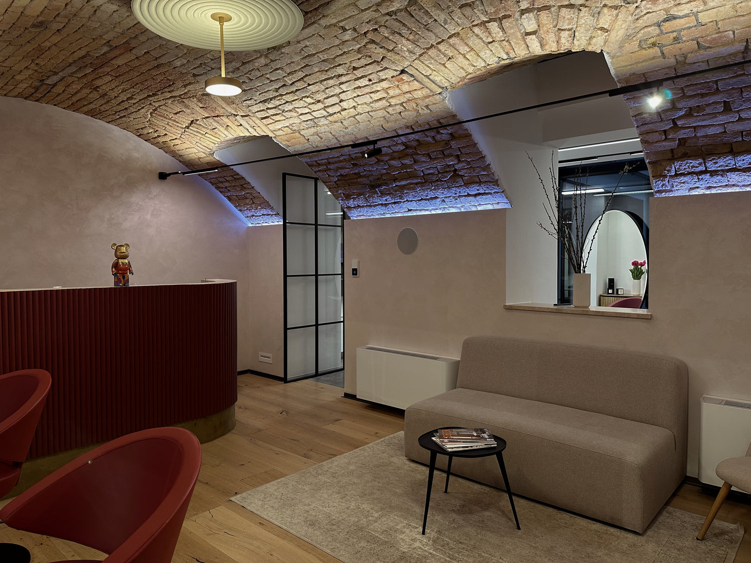 Az Alkotmány u. 21. szám alatt a kapun belépve egy folyosó fogad, annak végén pedig az épület egyedi tervezésű liftje, ami levisz a -1 szintre, ahol jobb kéz felől nyílik a szépségszalon.